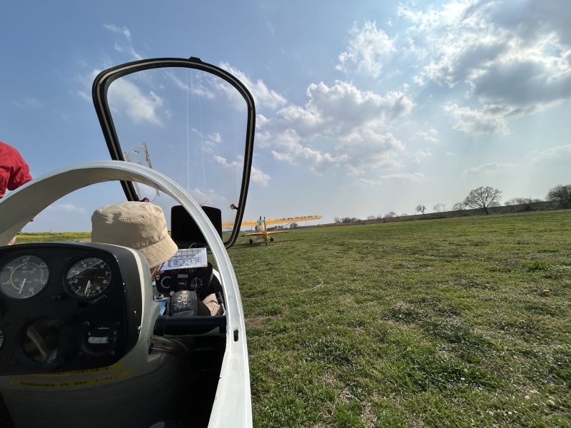 その後は、ドルフィンフライト(サーマルのある場所では速度を落として上昇し、それ以外の場所では高速で滑空して、イルカが海面を跳ねるように効率よく移動する技術)の要領で関宿方面まで向かい、追い風に乗って帰るつもりでしたが、想像以上に長い時間沈下に苦しめられ、関宿滑空場にアウトランディングしました。地上で訪れたことはありましたが、今回先輩と同乗して実際に着陸を経験できたことで、今後の緊急着陸場としてより安心感を持てると感じました。